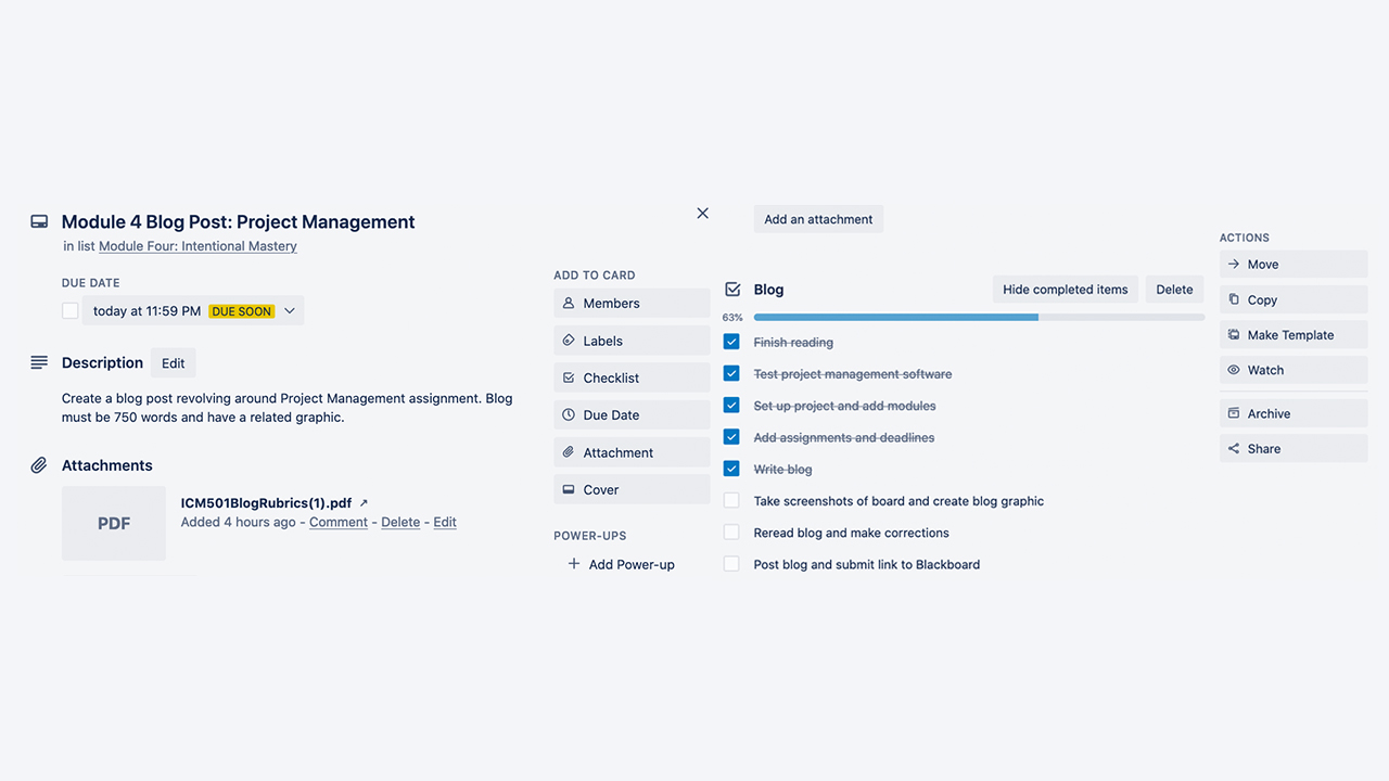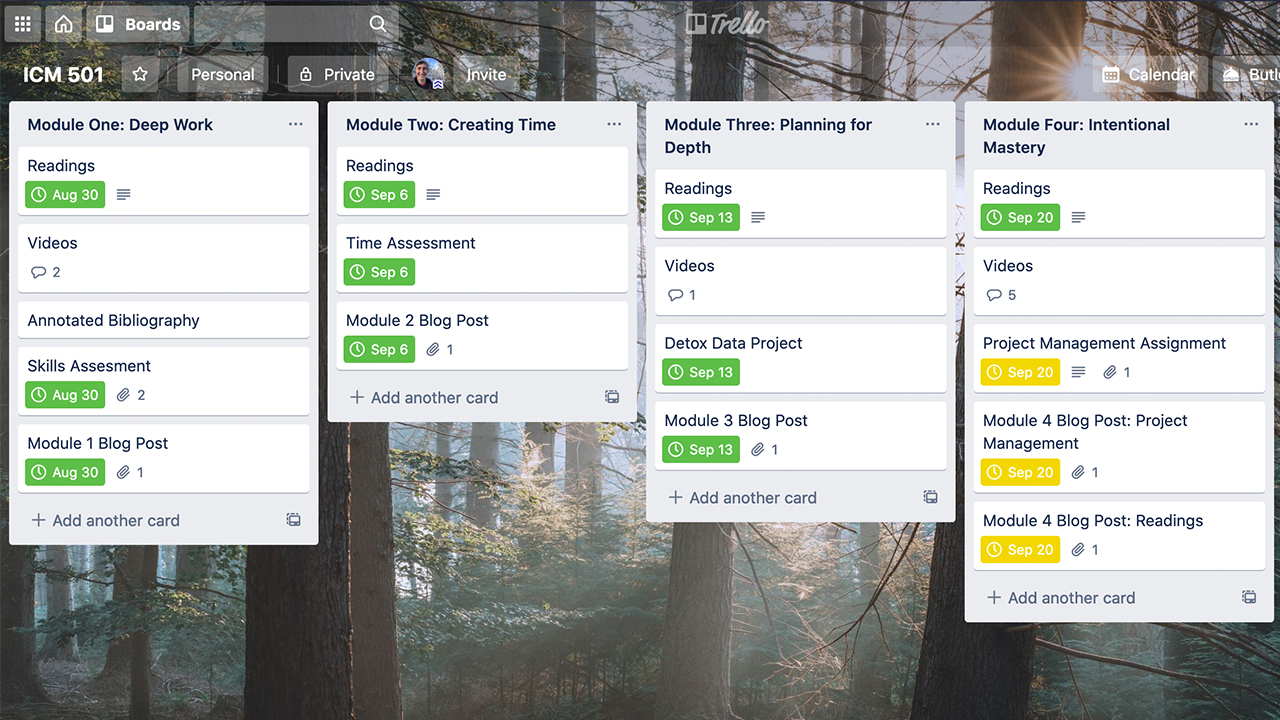 However, this time will be different. Instead of pen and paper, I will shift for a more technological approach. Trello, an online time-management tool, allows users to build boards to keep track of projects. For ICM 501, I built my project management system around the modules for the class. For each module, it includes cards for each of the readings, videos, and assignments we have had for the semester. At first, this process was difficult, as it felt like wasting time versus aiding me. That changed once I started playing around with Trello’s capabilities. For each of the readings, I can include links to the online versions and keep track of the additional readings I select for each module. Instead of going to Blackboard every time I want to access the additional video lectures, I can link and watch them from the board. For assignments, I can break the assignments into smaller components to help alleviate the stress of major projects.