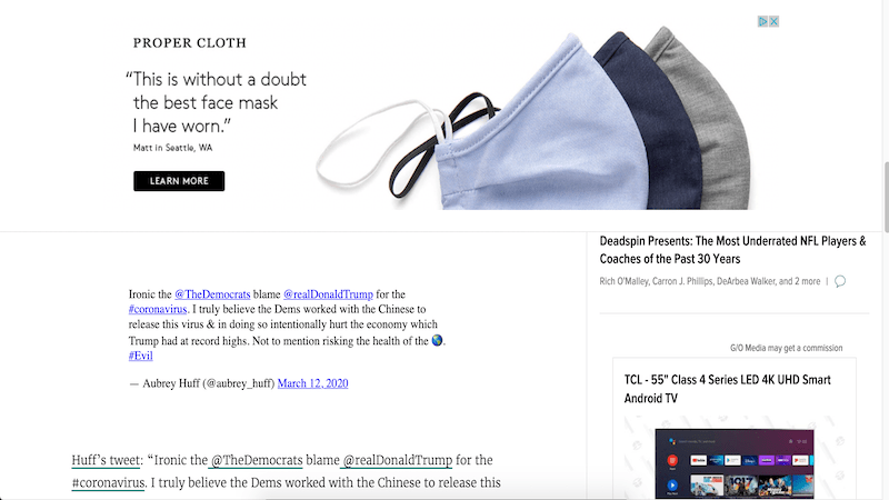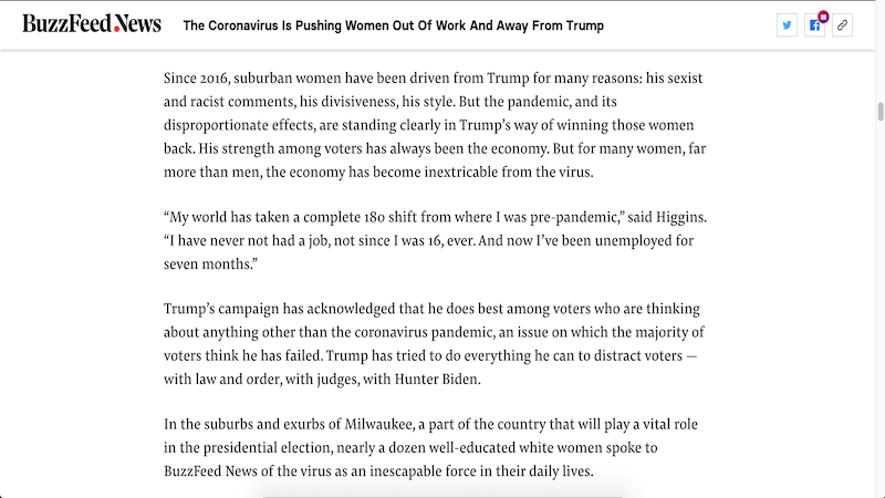 While there are some ads on the main page, they are small and not interfering with the content. The article The Coronavirus Is Pushing Women Out Of Work And Away From Trump is well written, and the top bar for the page disappears so you can focus on the words. Buzzfeed News gets a lot of flack for its juvenile sibling, but it has grown into a true journalistic outlet to stand with mainstream counterparts.
