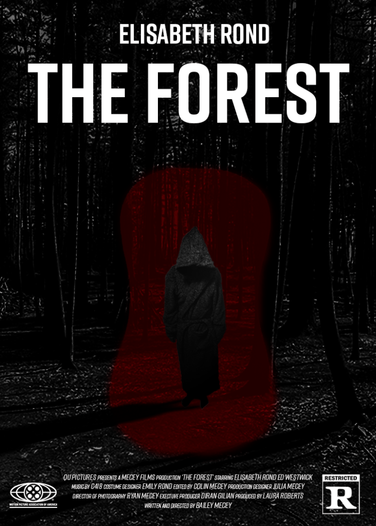 When I was putting together my poster, I wanted it to have a center focus that draws you in. I also wanted it to not be too busy with a lot of different colors. My poster is for a movie called ‘The Forest’. It portrays a hooded figure standing alone in a dark forest, standing inside an ominous demonic portal.