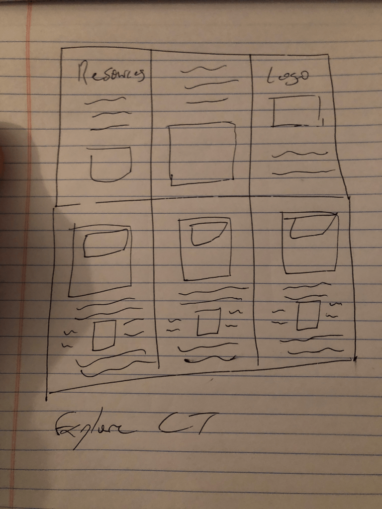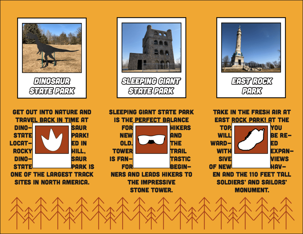 To begin, I sketched out my design and what goals I hoped to accomplish. The brochure would help promote different parks around Connecticut and highlight the fun of outdoor hiking. For my travel agency, I created the name Explore CT and made a graphic of a polaroid with a shape of Connecticut inside of it. The tagline “Take Nothing But Memories” harkens back to the signs one would see around parks, but shifts it back to the fun memories people make out on hikes.
