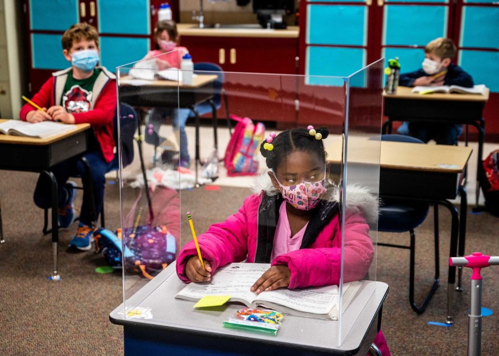 This image is of 1st graders back in school in California. Wearing masks and surrounded by plastic dividers, the before of this scene is these kids doing school on their computers. After this scene, it represents will most likely be the way school functions for the near future.
