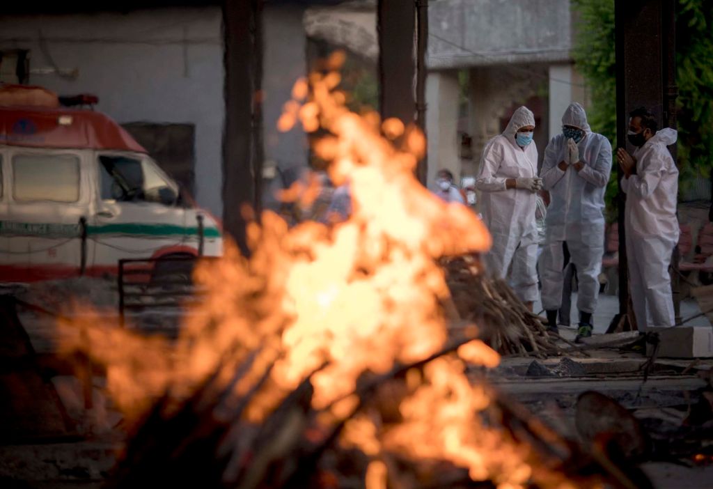 In this photo, relatives are performing last rites at a crematorium in New Delhi. Before this scene, we can imagine the relatives bringing the patient who has died to the crematorium. After, the relatives depart and figure out how to move on without them.