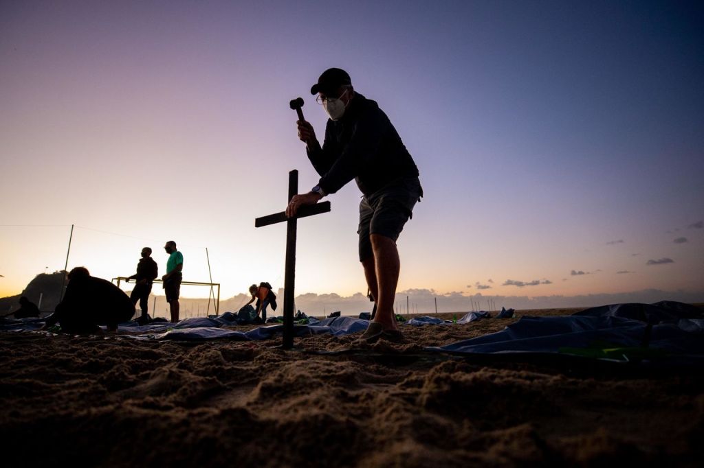 In this photo, a man places a cross on Copacabana Beach for an event marking Brazil’s death toll. Before we can imagine that this man has lost someone close due to COVID, and after what this will mean for the different communities in Rio de Janeiro.