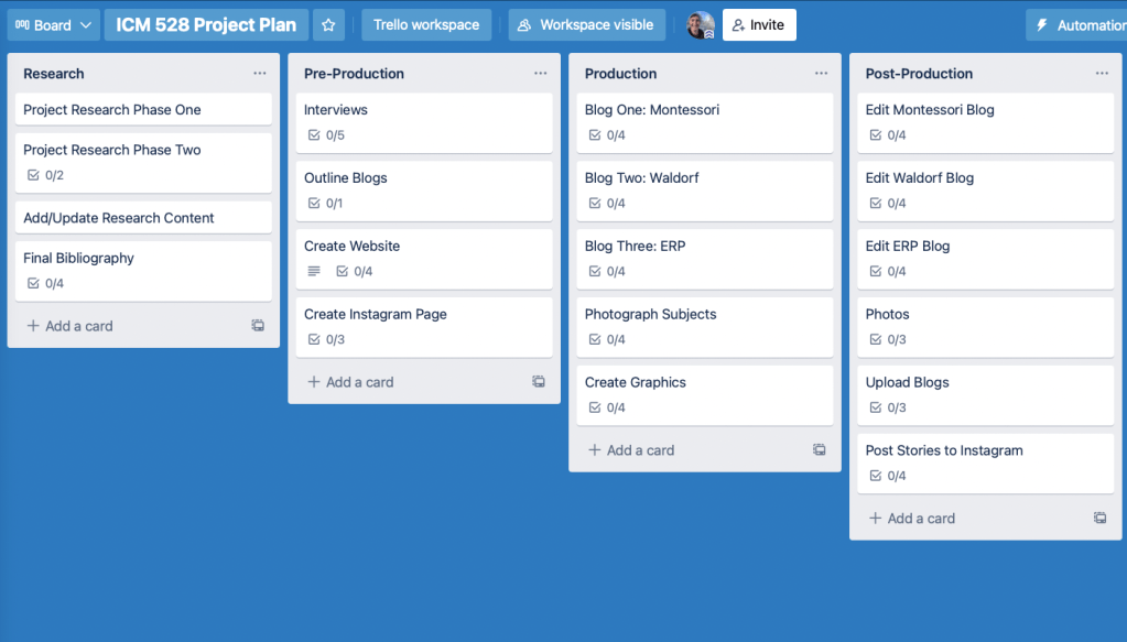 After making this change, it was essential to get organized. To do this, I created a project management plan. This plan, built in the management system Trello, would help me stay organized on what tasks to complete and stay focused. I tend to be a procrastinator when left to my devices, so it has been my goal to hold myself to a plan. Also, the project requires much planning, so having tasks built out helps a lot with direction.