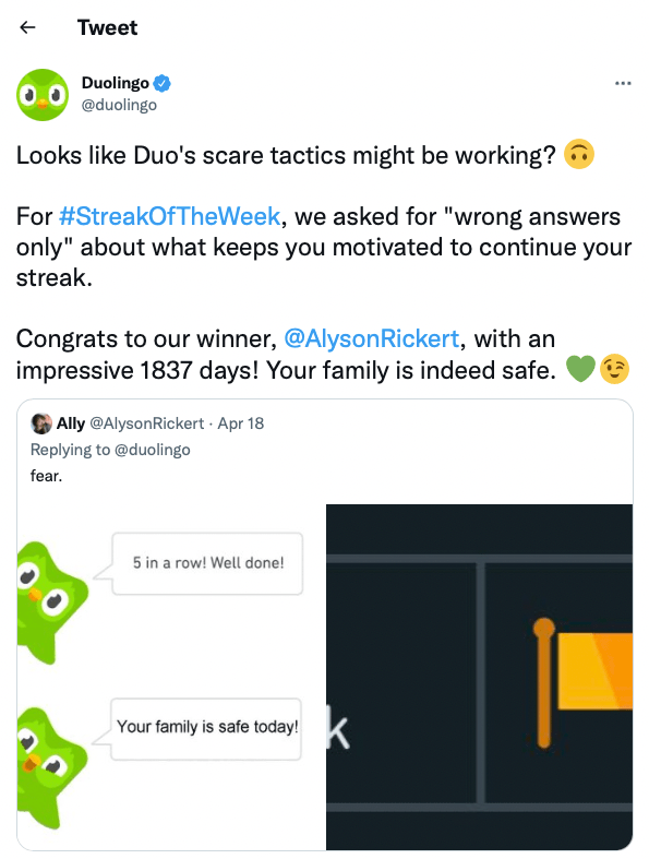 To engage with their community, Duolingo uses a variety of methods from both the app and user-generated content. When users complete their language activities for multiple days in a row, they are rewarded with a streak that they are encouraged to post about on social media. The main accounts will share the content with the hashtag #StreakoftheWeek.