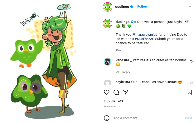Another method to encourage user-generated content is the promotion of fan art, with the hashtag #DuoFanArt. Community members will create art featuring the mascot, then the main account will reshare the art on their accounts. This type of content generation allows the community to feel more connected with the brand.
