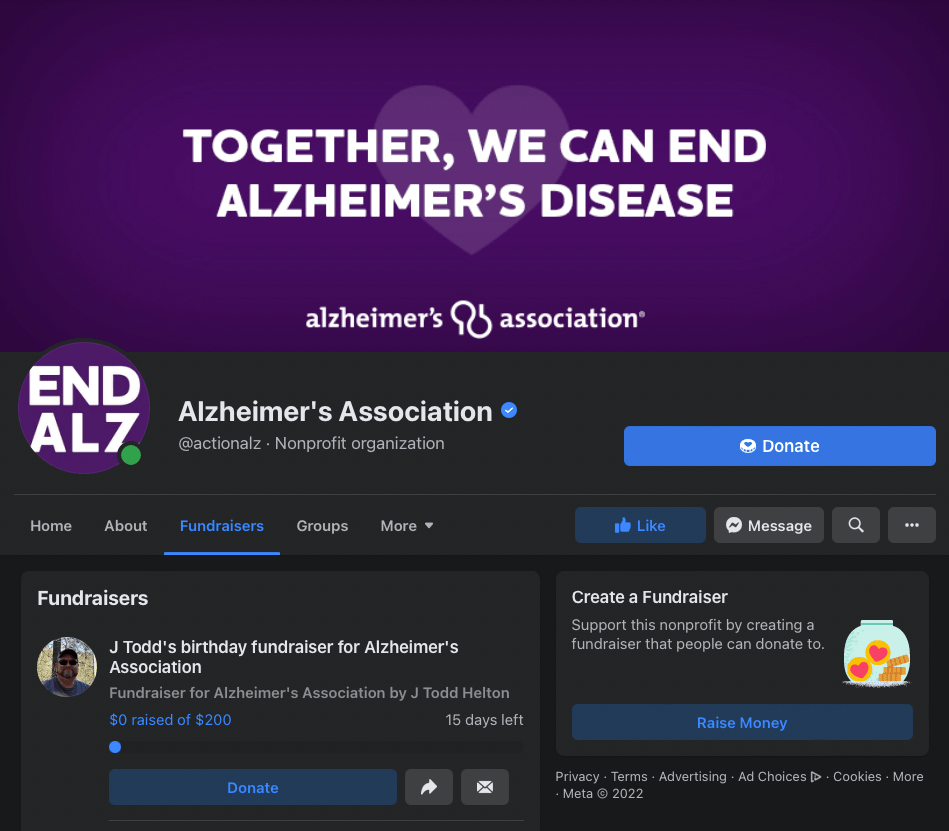 On Facebook, the Alzheimer’s Association utilizes the Fundraiser option to allow users to create a fundraiser and donate on their behalf. This allows users to feel they are having a direct impact on the organization, as well as creating a financial benefit through the donations they receive.